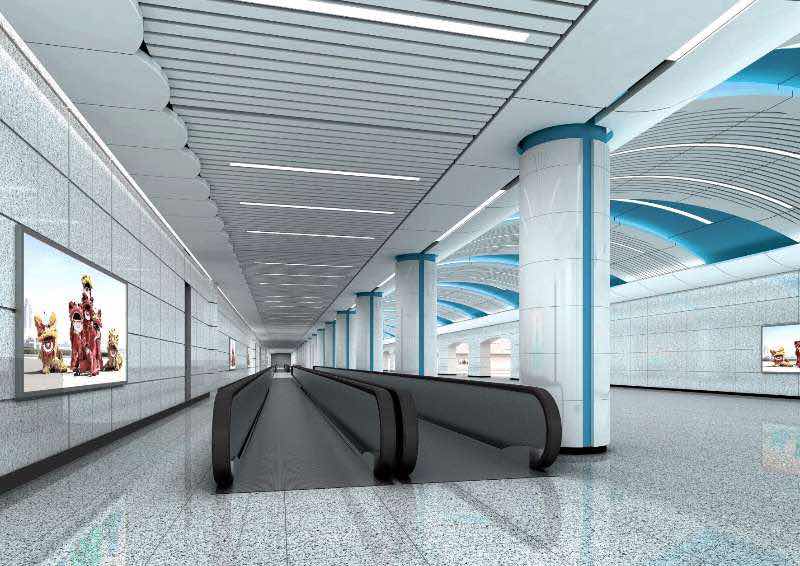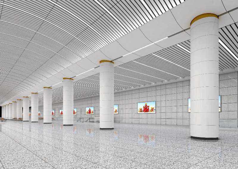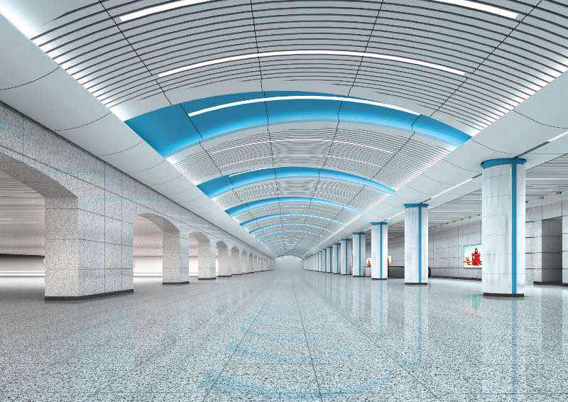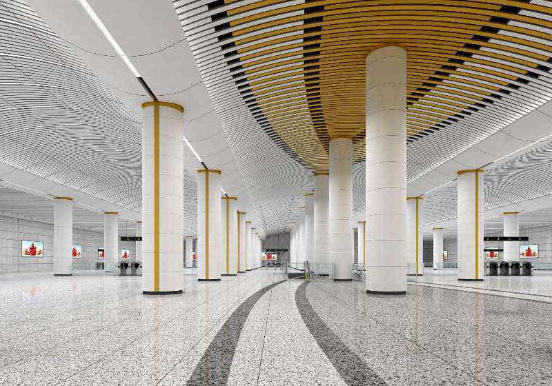 站廳則主要采用弧型吊頂,整體裝修簡約素雅風格,地面和墻面的材料均采用花崗巖,廊柱采用搪瓷鋼板。